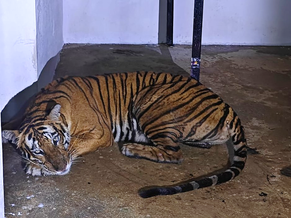 This captured male tiger is reportedly about 12-13 years old and its teeth are weak. Therefore, this tiger, which was unable to hunt herbivores in the forest, may have entered the neighbouring villages and attacked people and livestock.