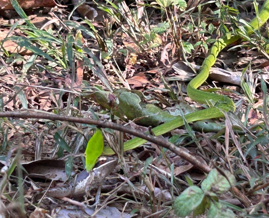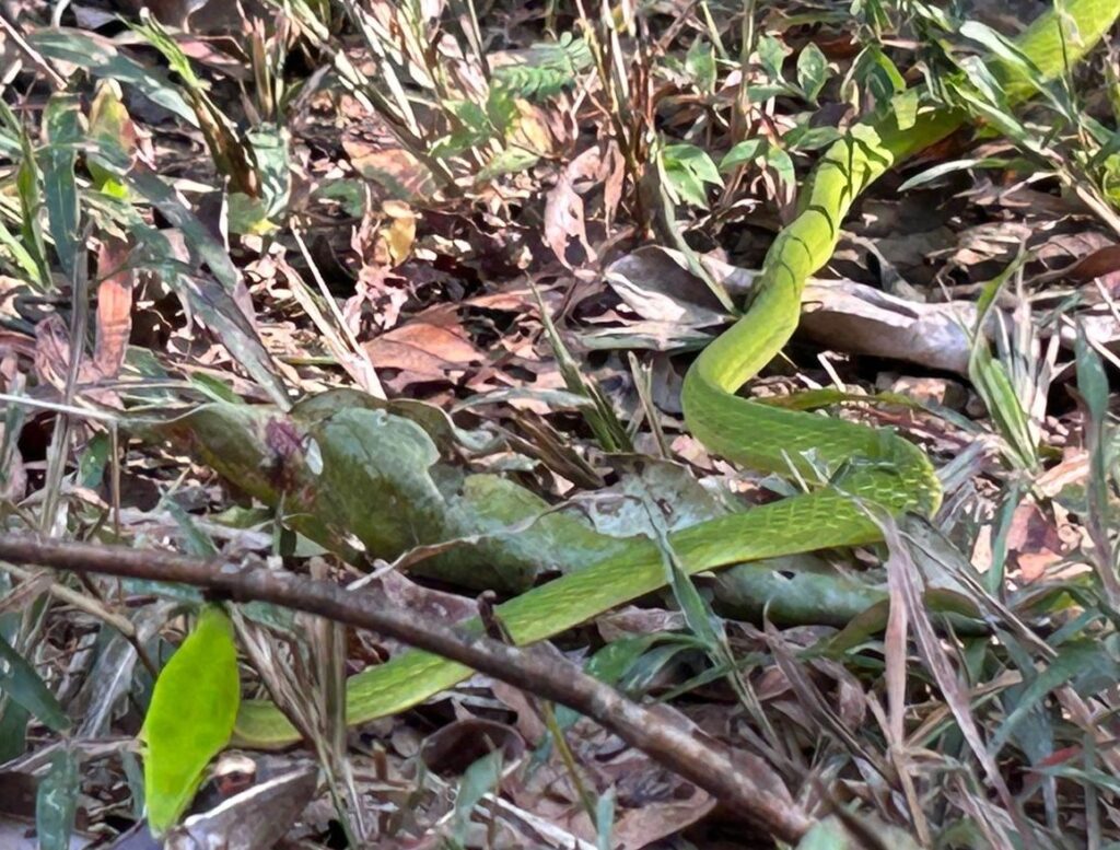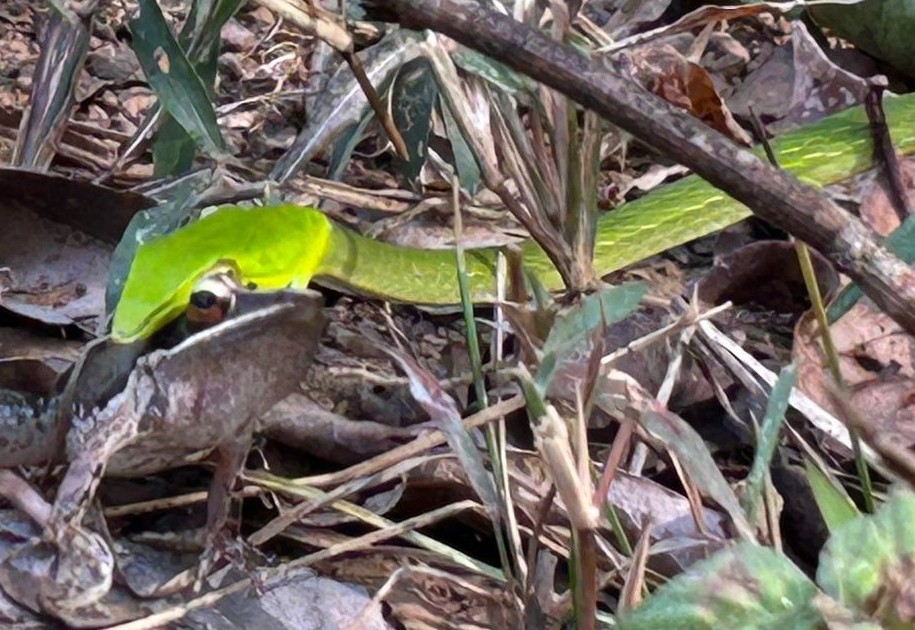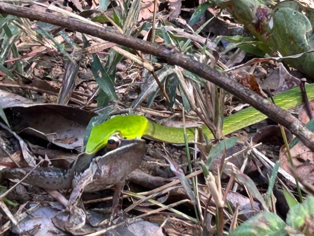 In this instance, the Northern Western Ghats Vine Snake had captured a frog which is one of its preferred preys. Using a swift strike and strong jaws, it can hunt very fast. They are known to rely mainly on their vision to detect movement and typically hunt during the day. By preying on frogs, these green vine snakes help in regulating the population of amphibians and also maintain the ecological balance.