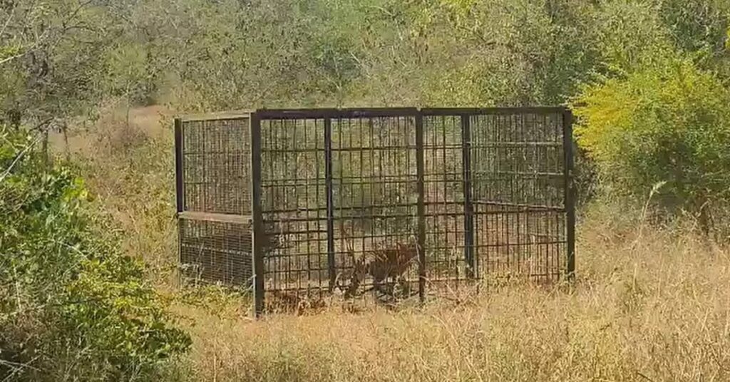 The Tumkur Cage is a large, camouflaged trap about 15 x12x10 feet (length x width x height) andis used to safely capture conflict leopards. However, the NTCA guidelines and related protocol state a large trap cage – approximately 10 x 4 x 4 feet (length x width x height) should be used for capturing tigers. The cage should be robust, often made of Mild Steel angle frames and covered with thick iron sheets and/or strong wire mesh. The primary goal of the cage design, as per the NTCA guidelines, is to ensure the safety and welfare of the tigers during capture.