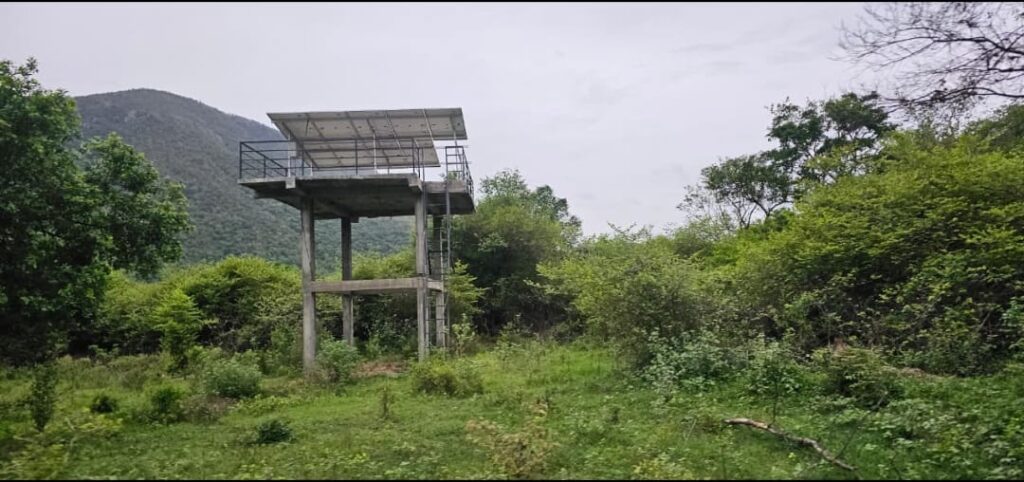 One of the most troubling interventions inside Cauvery Sanctuary has been the construction of solar-powered towers to pump water into artificial tanks. These are not minor structures. They require clearance and levelling, concrete bases, metal frameworks, wiring, and repeated human entry for maintenance.