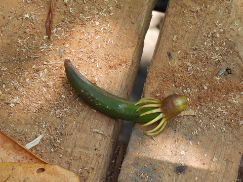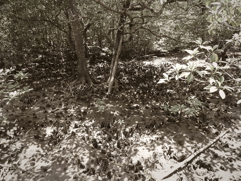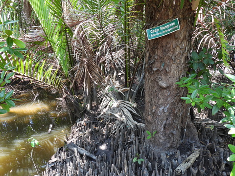 Rhizophora apiculata (Tall-stilted mangrove or Black Mangrove): Luxuriant growth of this species can be found here. It is found in proximal zone while adapting to high salinity and waterlogged conditions with its characteristic stilt roots. Fruits are dark brown and viviparous in nature.
