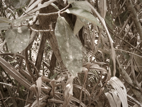 Rhizophora mucronate (Red Mangrove): Known as Kala Khadi, they are found throughout the A & N Islands. Found in proximal (seaward) zone of mangrove forests, they flower and fruit throughout the year. This is a moderate sized tree with rough bark, stilt root with mucronate apex on the leathery leaves and yellowish-white flowers.